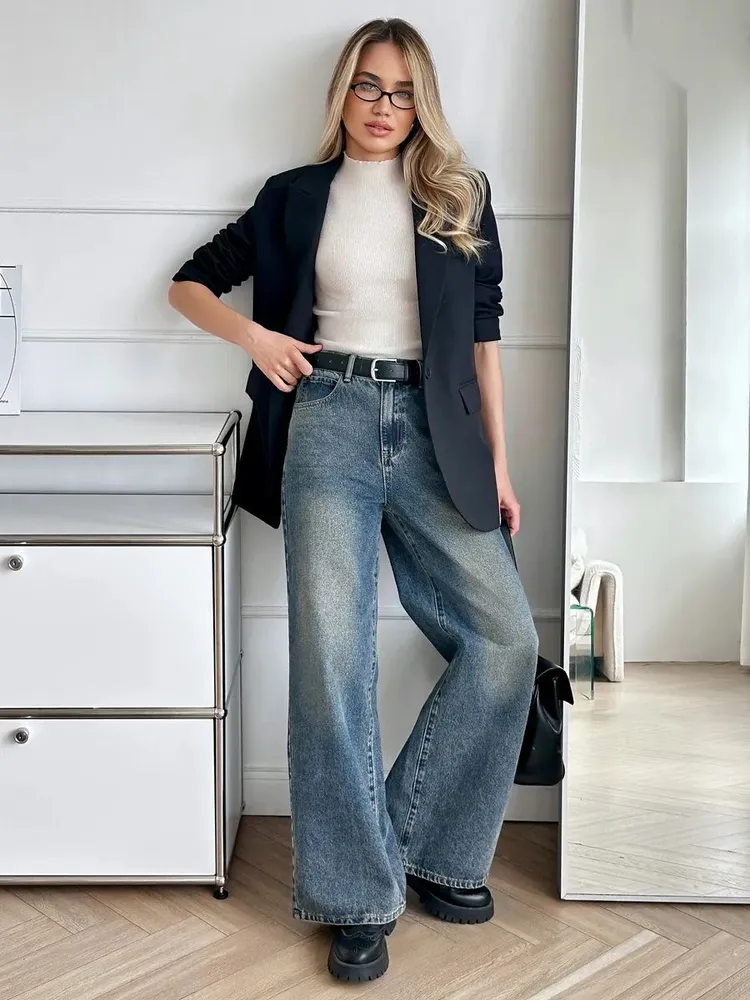 Джинсы женские прямые широкие с высокой посадкой коллекции осень-зима 2025-2026 от бренда Fine Joyce. Джинсы багги сине зеленые винтаж с грязным эффектом клеш от бедра с высокой посадкой. Такой фасон y2k подходит на разный тип фигур: подчеркивает талию, комфортен для широких бедер, свободный крой штанины не стесняет движений. Их универсальность позволяет создавать разнообразные образы для любых случаев. Прямой широкий крой делает эту модель фаворитом одежды для женщин и девочек подростков. Такие джинсы трубы садятся на любой тип фигуры и подойдут как для высоких, так и низких ростом женщин и девушек. Джинсы с широкими штанинами выполнены из плотного денима, застежка на молнию и металлическую пуговицу, пять карманов, кожаный патч, высокая посадка. Высококачественный хлопковый деним и винтажный цвет считается главными преимуществами этой модели. Джинсы женские широкие окрашены натуральными, не агрессивными красителями, которые экологичны и безопасны. Сделанные по последним технологиям они удовлетворят самые высокие требования к одежде. Ткань достаточно плотная износостойкая, после стирки штаны не садятся, а после длительного ношения не вытягиваются. Высокая посадка зрительно удлиняет ноги и придает стройности. Женская одежда от Fine Joyce – лучший выбор по цене и качеству. Наша цель – расширить Вашу коллекцию практичной и стильной новинкой.