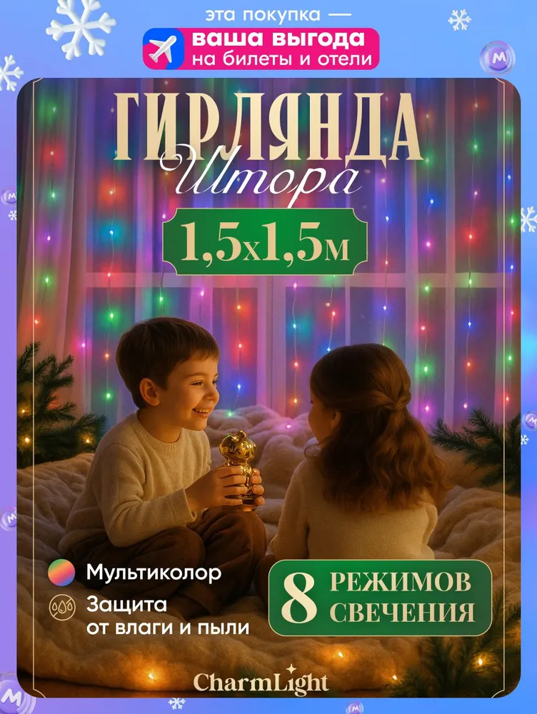 Характеристики: Гирлянда штора, новогодняя, на окно, шторка 1,5 х 1,5 м, микс. Электрогирлянда интерьерная