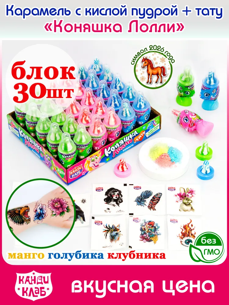 Карамель леденцовая КОНЯШКА ЛОЛЛИ символ 2026 года кислая пудра + татуировка (блок 30шт по 5гр) конфеты Канди Клаб. Набор тату ассорти клубника голубика манго. Подарок в день рождения Новый год Лошади