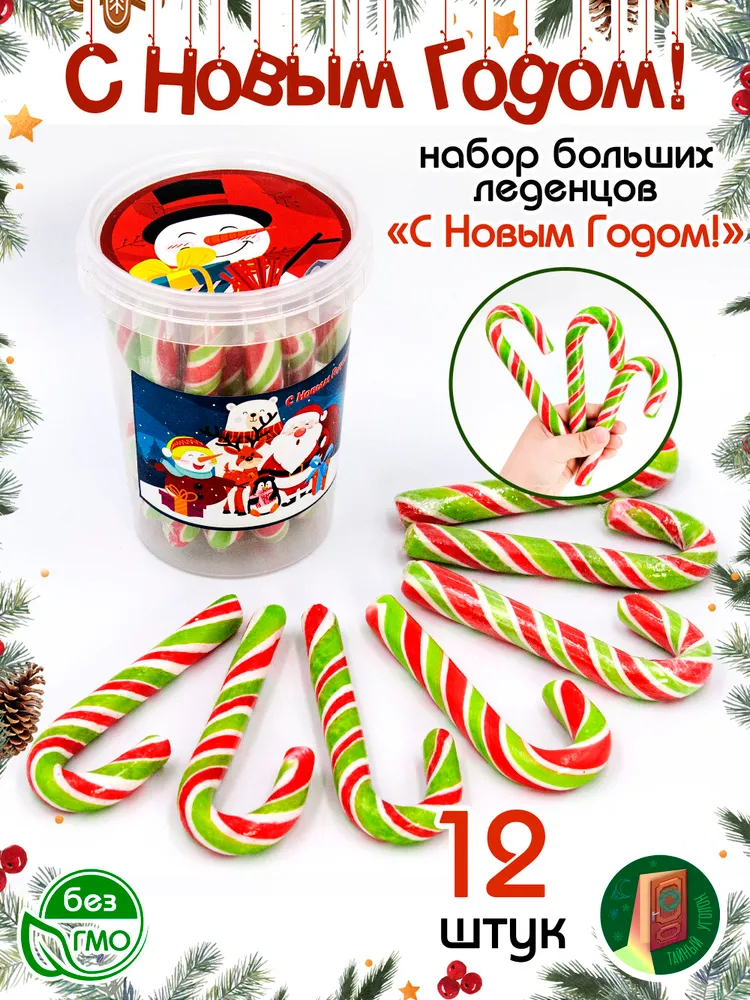 Карамель леденцовая НОВОГОДНИЕ БОЛЬШИЕ ТРОСТИ (ведерко 12шт по 20гр). Набор конфет, леденцов, сладкий #1