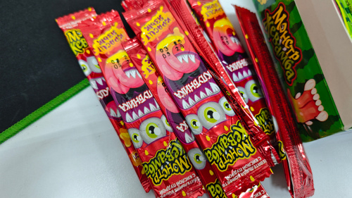 Конфета жевательная с кислой пудрой, красит язык. Блок 48шт по 8гр ассорти вкусов