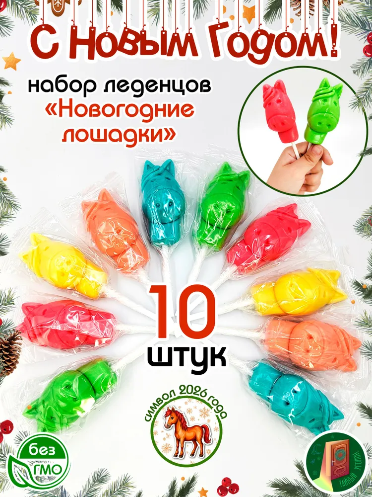 Карамель леденцовая НОВОГОДНИЕ ЛОШАДКИ символ 2026 года (10шт по 25гр). Набор конфет, тростей, леденцов #1