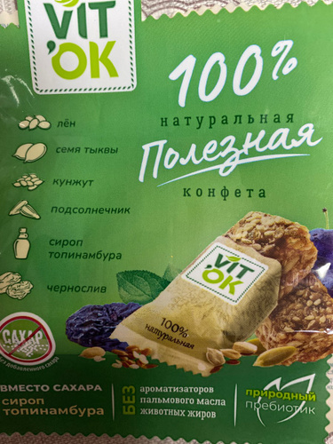 ядра семян подсолнечника, пюре сливовое, семена кунжута, глюкозный сироп, семена льна, ядра семян тыквы, сироп из топинамбура, хлопья овсяные, масло растительное кокосовое, пищевое цитрусовое волокно, эмульгатор соевый лецитин, экстракт сухой - рябина красная плоды (мальтодекстрин; экстракт рябины красной водный).