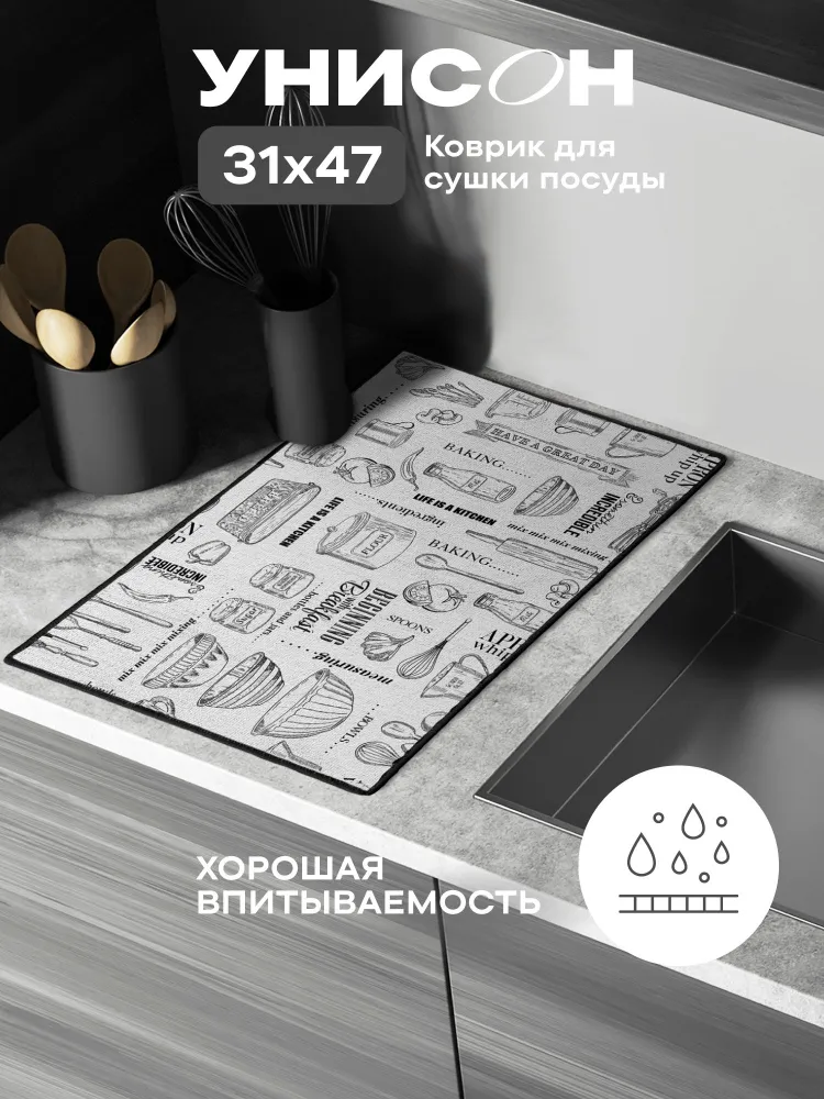 Коврик для сушки посуды, коврик для посуды впитывающий 31х47 Унисон черный