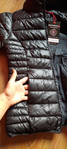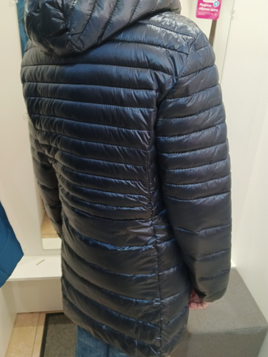 Отличный удлиненный пуховик (48 размер длина чуть выше колена). Проверила его и в дождь и в холод. Не промокает и не продувает.В морозы конечно не попала, но все впереди. Отшит аккуратно. Строчки ровные. Единственное, хотелось что бы замок был двухсторонний и нет внутреннего кармана.