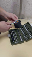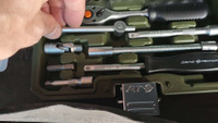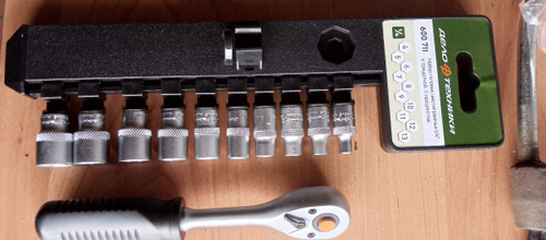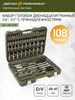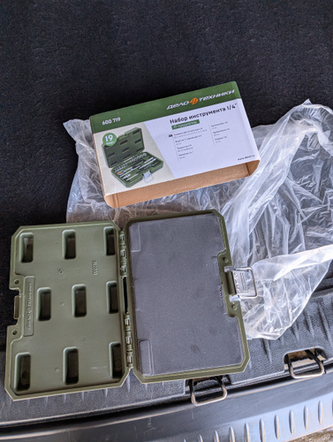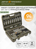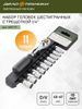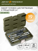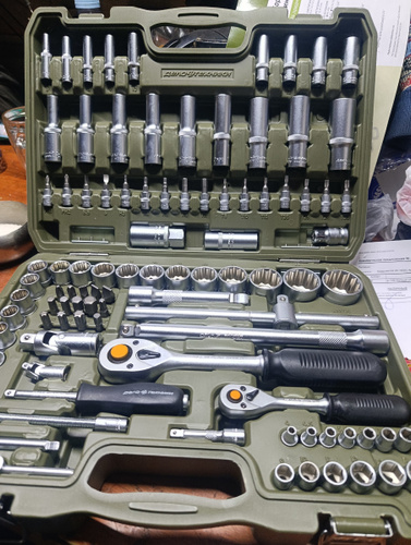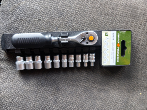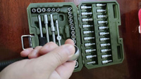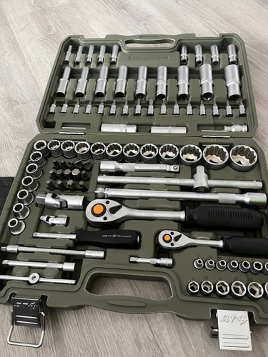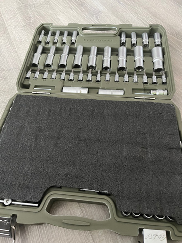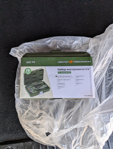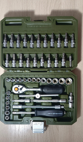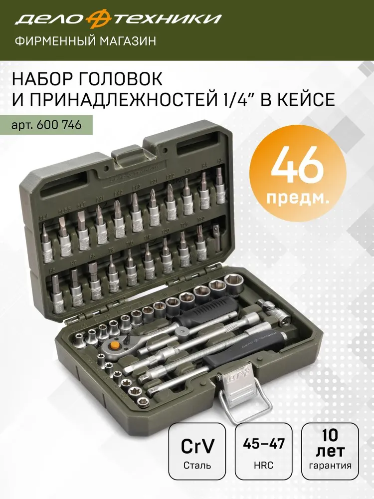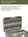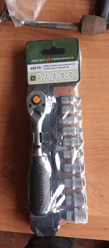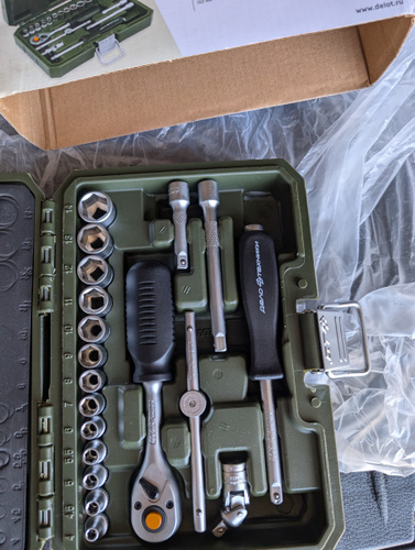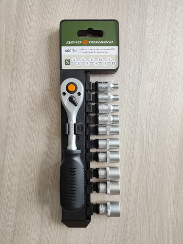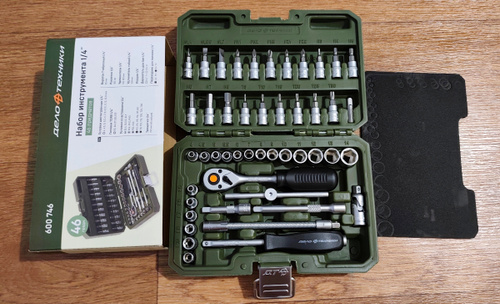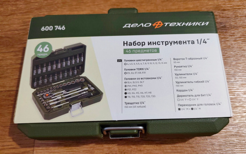 Головки шестигранные 1/4": 4; 4,5; 5; 5,5; 6; 7; 8; 9; 10; 11; 12; 13, 14 мм Головки Torx 1/4˝: E5, E6, E7, E8, E10 Головки со вставками 1/4˝: Шлиц SL4; SL5,5; SL7 мм Крест PH1, PH2, PH3 Pozidriv PZ1, PZ2 Hex 3, 4, 5, 6, 7, 8 мм Torx Т8, Т10, Т15, Т20, Т25, Т30 Вороток 1/4˝ 115 мм Трещотка 1/4˝ 150 мм (45 зубцов) Рукоятка 1/4˝ 150 мм Удлинители 1/4˝ 50, 100 мм Удлинитель гибкий 1/4˝ 145 мм Кардан 1/4˝ 45 мм Адаптер для шуруповёрта 1/4˝М × 1/4˝М