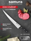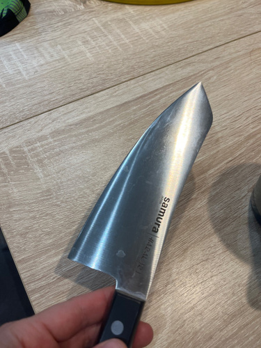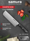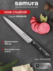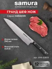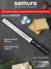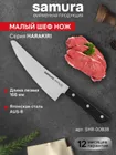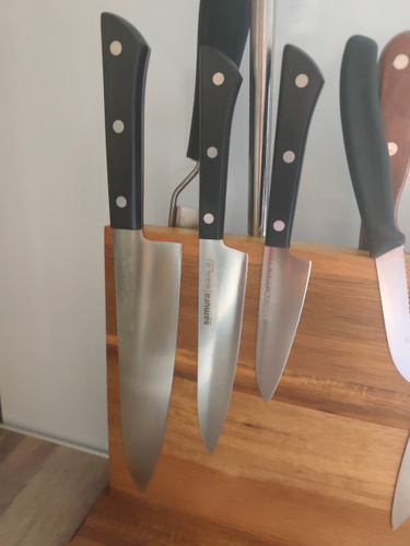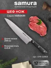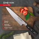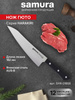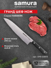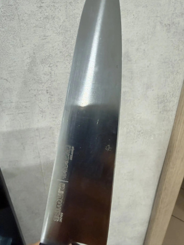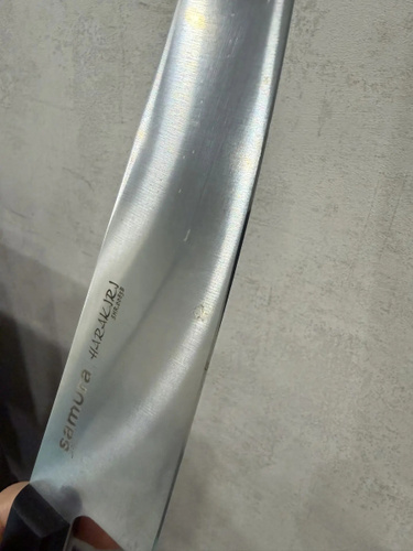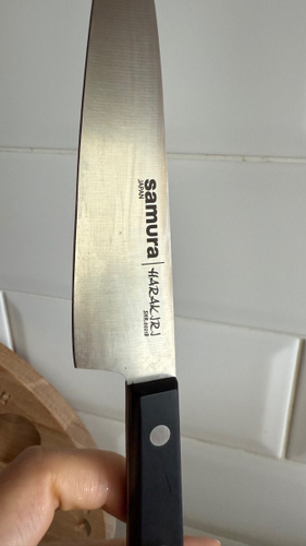 Шеф-нож — самый крупный и увесистый в наборе ножей Samura. Имеет многопрофильное назначение, но больше всего подходит для грубой и тяжелой работы – разделки птицы, кролика и рыбы, рубки стейков, шинковки крупных овощей. С его помощью удобно превратить в фарш кусок мясного филе прямо на разделочной доске или порезать ингредиенты для супа или овощного рагу. Пята лезвия – самая широкая часть режущего полотна, подходит для рубки хрящей. Узким кончиком легко нарезать небольшие продукты – грибы, зелень, лук или перец.
