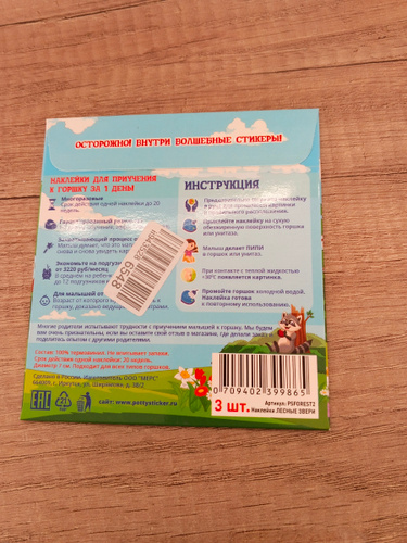 Товар никак не упакован был. Наклейки крупные,хорошие,про нагревании проявляется цветной рисунок. Липкая сторона качественная,ребенок не смог оторвать,но видимо из-за того,что пока не мочили их.