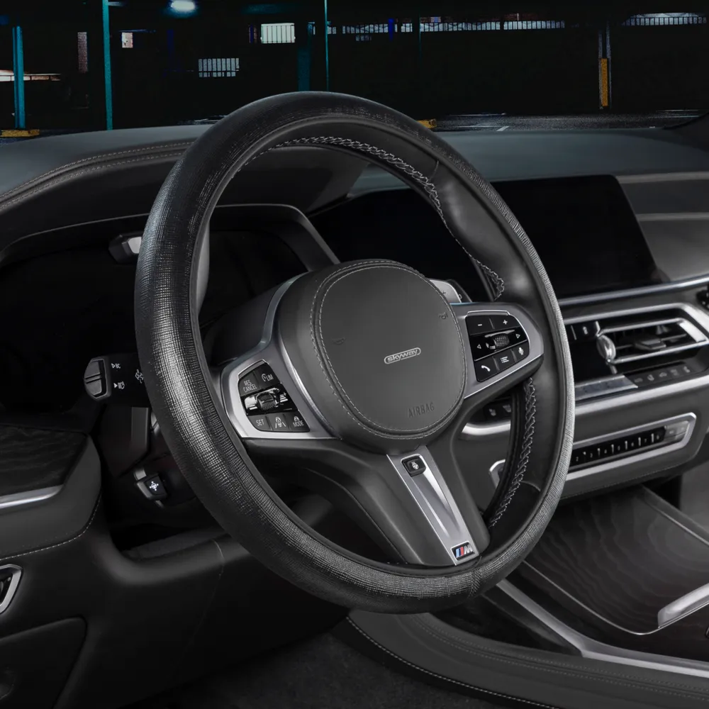 Классическая оплетка из черной экокожи — лучшее решение среди аксессуаров для машины в салон. Универсальный размер 38 см (37-39) делает этот чехол на руль автомобиля универсальным для большинства автомобилей: