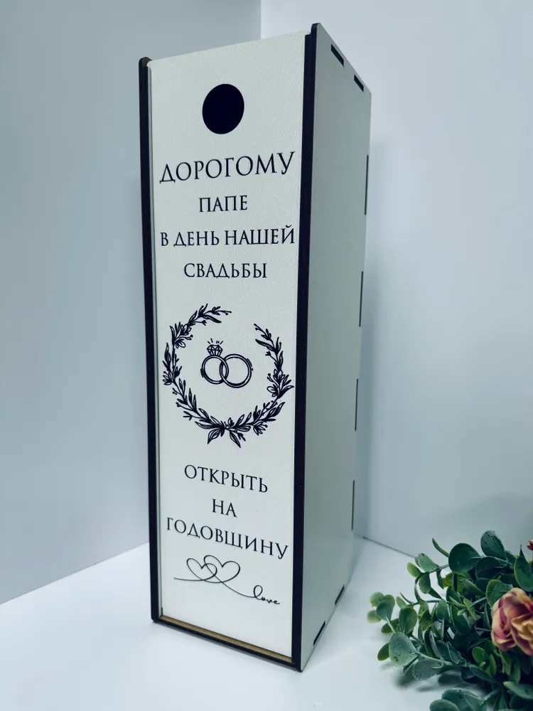 Коробка предназначена для молодых супругов, которые хотят подарить папе нечто особенное. Создавая атмосферу праздника, такой аксессуар поможет сделать этот момент более запоминающимся и трогательным. Она выполнена из качественного материала, что обеспечивает надежность и долговечность. Внешний размер коробки В*Ш*Г 34.5х10.5х11 см (внутренние размеры коробки В*Ш*Г 33.5х9,5х9 см).Эта коробка под бутылку прекрасно оформлена, что делает её не только практичным элементом упаковки, но и стильным аксессуаром для любого праздничного стола. Каждый элемент коробки тщательно продуман, что придает ей элегантности. Создайте с помощью этой упаковки незабываемый подарок, который порадует Вашего папу в столь важный день и станет прекрасным воспоминанием на долгие годы.Не упустите возможность выразить свои теплые чувства и заботу с помощью этой удивительной подарочной коробки. Она не только красиво смотрится, но и благодаря своей форме и размеру идеально подходит для транспортировки и хранения бутылки. Наполните коробку любимым напитком для папы и подготовьте неординарный сюрприз.Данная подарочная коробка под напиток – это не только удобный способ упаковки, но и стильный элемент вашего свадебного торжества. Подчеркните важность момента и сделайте свое поздравление особенно запоминающимся с помощью этой эксклюзивной коробки.