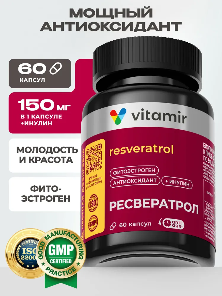 ресвератрол (из экстракта горца японского), инулин (из корня цикория), микрокристаллическая целлюлоза (носитель), кальция гидрофосфат (носитель), крахмал картофельный, поливинилпирролидон (стабилизатор), магниевая соль стеариновой кислоты (агент антислеживающий), капсула (гидроксипропилметилцеллюлоза (носитель), вода).