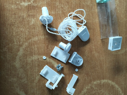Труба с тканью - 1шт. Цепь управления - 1 шт. Крышка нижняя боковая - 2 шт. Стальной утяжелитель - 1 шт. Ограничитель цепи управления - 1шт. Платформа для скотча - 2 шт. Скотч - 2 шт. Магнит - 2 шт