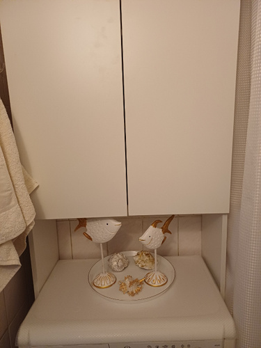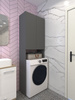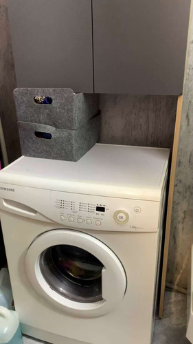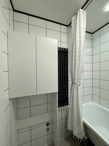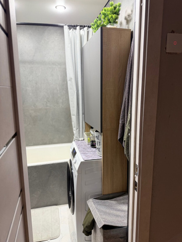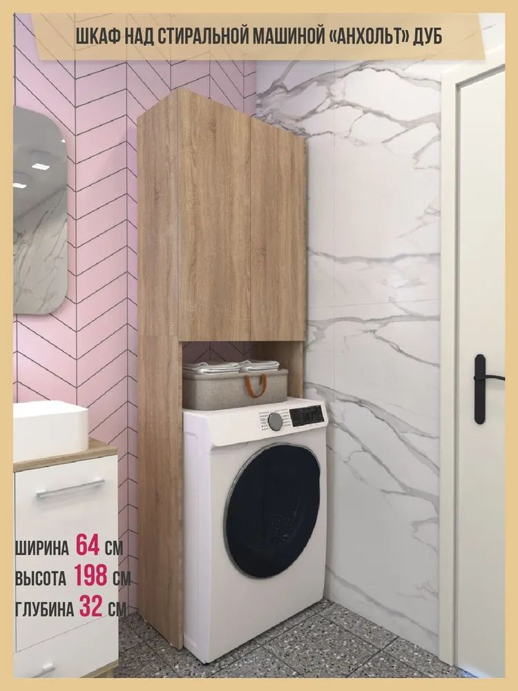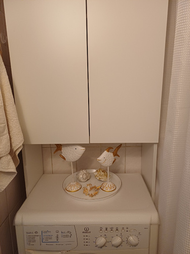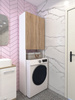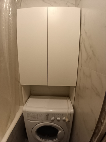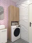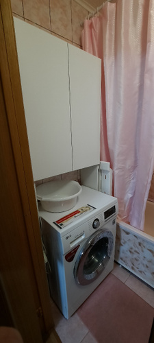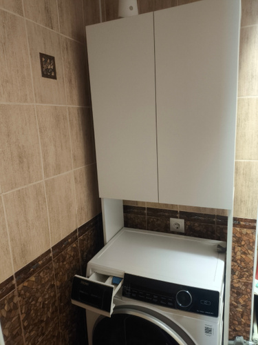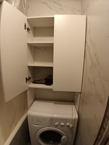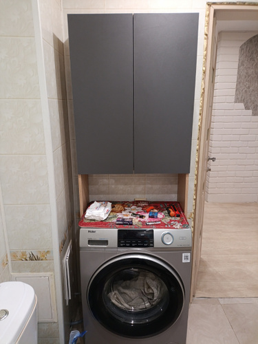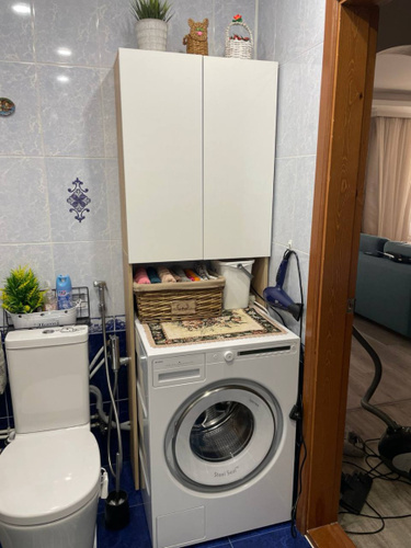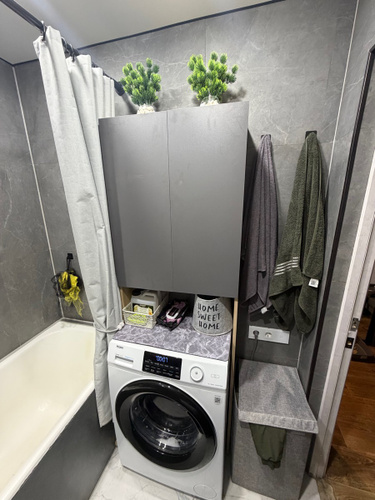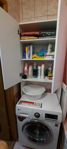 встал над машинкой идеально.Есть расстояние от машинки до первой полки,можно использовать пространство.Удобный,компактный не занял много места в маленькой ванной.