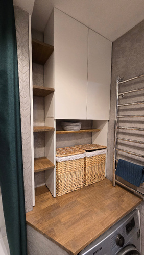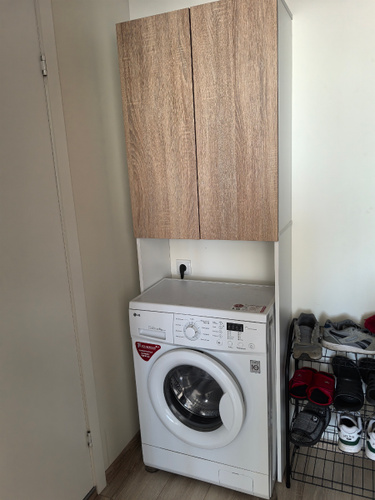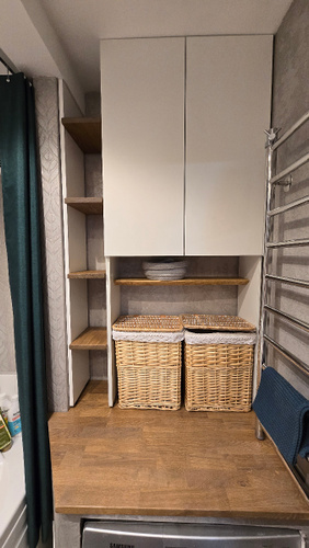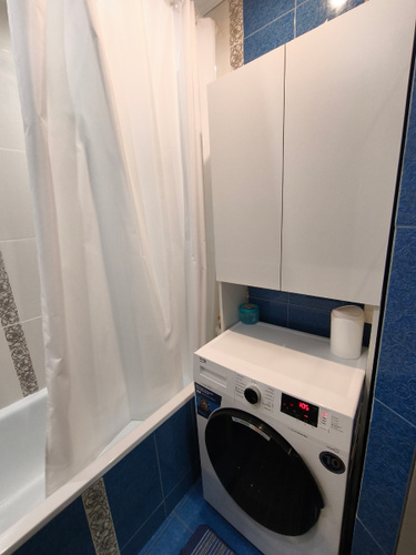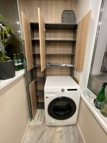 Классный шкаф, очень вместительный, шланги удалось пустить под ножками, конечно я побаиваюсь отжима машинки, хоть она и стоит на подставках и не сильно гуляет в разные стороны, но она так впритык встала и не много съезжает влево или вправо, но тест драйв пройден, стирала постельное белье на оборотах 1200, всё целое 😁