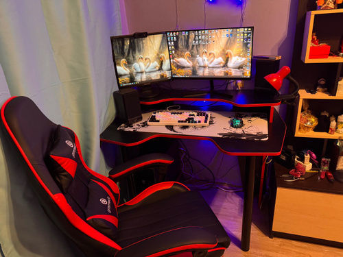 Любителей видеоигр особенно порадует продуманная организация пространства для размещения всего необходимого игрового оборудования. На столе удобно размещаются монитор, клавиатура, мышь и другие игровые аксессуары, обеспечивая максимальный комфорт во время игровых сессий. Так же на столе можно разместить подставку для геймпада, которая позволяет держать под рукой это важное устройство как для игр на ПК, так и для консолей. Это решение значительно повышает удобство использования игрового оборудования и помогает поддерживать порядок на рабочем пространстве. Игровой стол создан с учетом всех потребностей современных геймеров, сочетая в себе практичность, эргономику и стильный внешний вид. Это не просто мебель, а настоящий центр для погружения в мир видеоигр, игровая комната, комната геймера, игровое место.