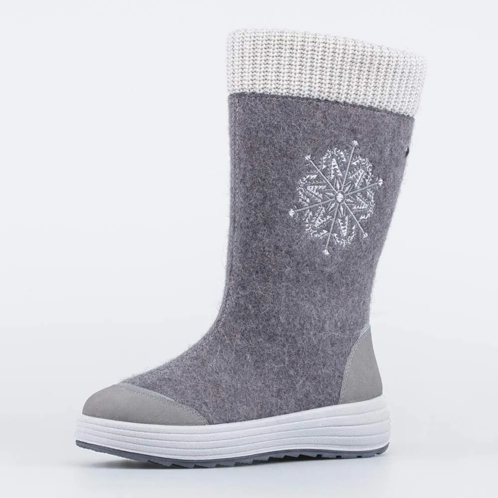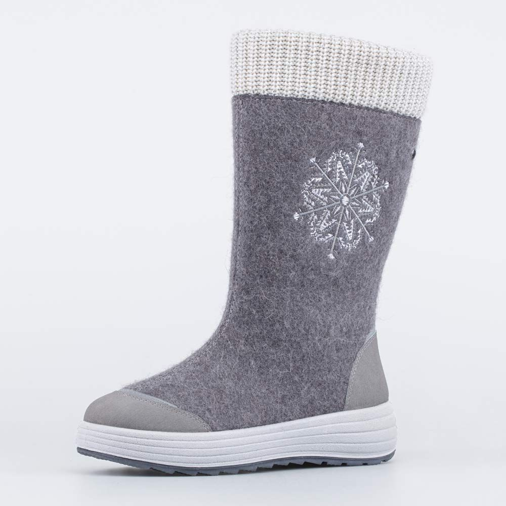 Женские валенки выполнены в сером цвете. Верх и стелька - из натурального войлока, на 100% состоящего из овечьей шерсти. Он дарит ногам целебное сухое тепло и оказывает массажный эффект. Подкладка из шерстяного меха, более чем на 80% состоящего из овечьей шерсти, обеспечивают тепло даже в лютый мороз. Застежка-молния позволяет быстро обуваться и разуваться. Модель украшена вышивкой, голенище заканчивается вязаным манжетом. Модная кедовая подошва из ПУ (полиуретана) дополнена резиновой накладкой для придания устойчивости на зимних поверхностях. Модель анатомически правильная: есть приподнятость пяточной части по отношению к носочной, которая незаметна внешне. Стелька из натурального войлока/шерсти приформовывается к своду стопы, создавая индивидуальную форму внутреннего пространства в обуви. Сделано в России.