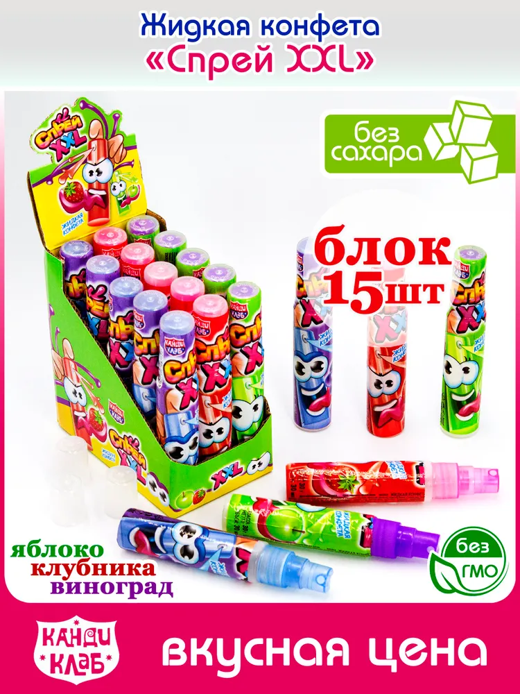 Жидкая конфета СПРЕЙ XXL (блок 15шт по 30мл) Канди Клаб. Набор без сахара ассорти микс со вкусом яблоко, клубника, виноград. Подарок детям на праздник день рождения, 8 марта, 23 февраля, Новый год